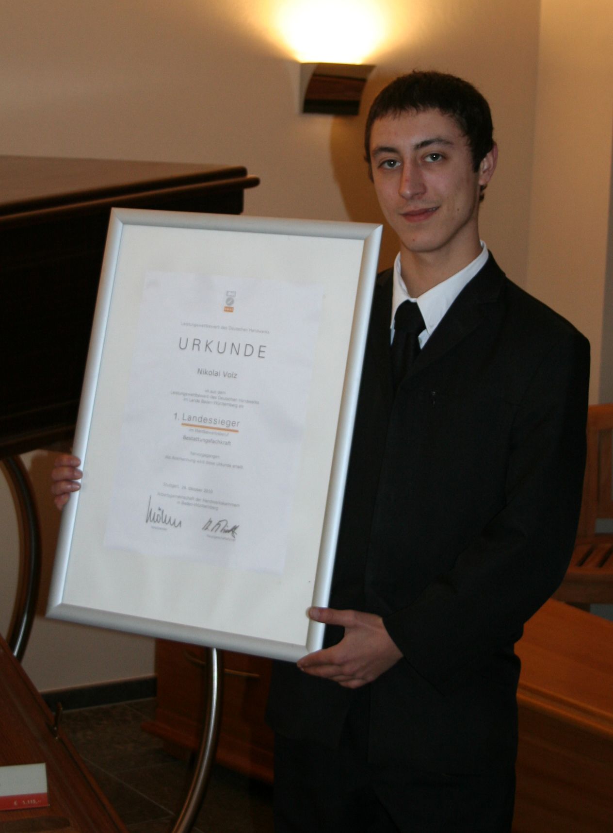Nikolai Volz schloss seine Ausbildung als Landes- und Kammersieger (HWK Freiburg) ab und ist Beisitzer der Landesinnung Bestattungsgewerbe Baden-Württemberg.